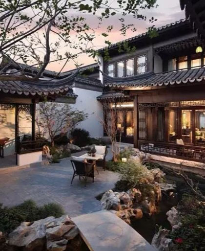 【江南風(fēng)韻中式庭院】 中式庭院,以江南園林建筑為原型,以明清古建形態(tài)為基礎(chǔ),青磚黛瓦、白墻漏窗、飛檐掛落等在細(xì)節(jié)上通過化繁為簡(jiǎn)的處理手法,把江南園林里“水、石、亭、橋、廊、漏窗”這一整套園林系統(tǒng)全部進(jìn)行了重塑。既有詩情畫意之幽,又有夢(mèng)回從前之境,唯有真正熱愛中國文化的人,才能與之產(chǎn)生精神共鳴。 “崇尚自然,師法自然”是中國園林所遵循的一條不可動(dòng)搖的原則。在這種思想的影響下,中國園林把建筑、山水、植物有機(jī)地融合為一體,創(chuàng)造出與自然環(huán)境協(xié)調(diào)共生、天人合一的藝術(shù)綜合體。中式庭院之美,以其緩緩流淌的文化氣質(zhì),深受人們的喜愛。庭院深深深幾許,蕭瑟寒煙,梧桐協(xié)細(xì)雨,樓前芳草自凝綠,江南風(fēng)韻亦悠在。 我傾心于這樣的時(shí)光,素心淡淡,一茶,一書,一筆,用文字腌制心情,一座城,一人靜,于浮世清歡里細(xì)煮光陰,在得失榮辱中點(diǎn)綴流年行人更在天涯處。江南風(fēng)韻中式庭院的筒瓦與小青瓦。