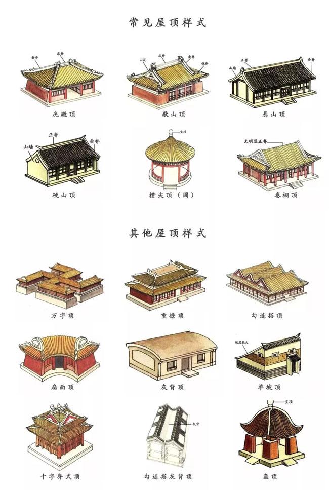 歇”了一歇,故名歇山頂。其上半部分為懸山頂或硬山頂?shù)臉邮剑掳氩糠謩t為廡殿頂?shù)臉邮?。常?jiàn)于宮殿、園林、壇廟式建筑